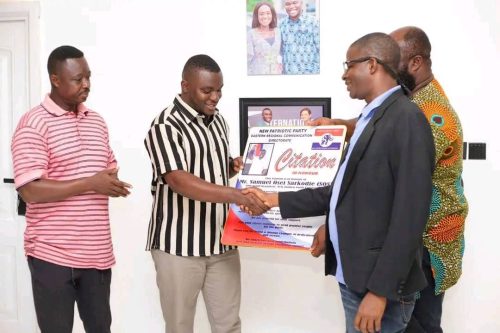In a brief but significant ceremony held at his residence, the regional team, led by Deputy Communication Director Mr. El Sahmed, presented a citation of honour to Mr. Sarkodie, popularly known as SOS, in recognition of his unwavering contribution toward strengthening the party’s communication and grassroots structures.